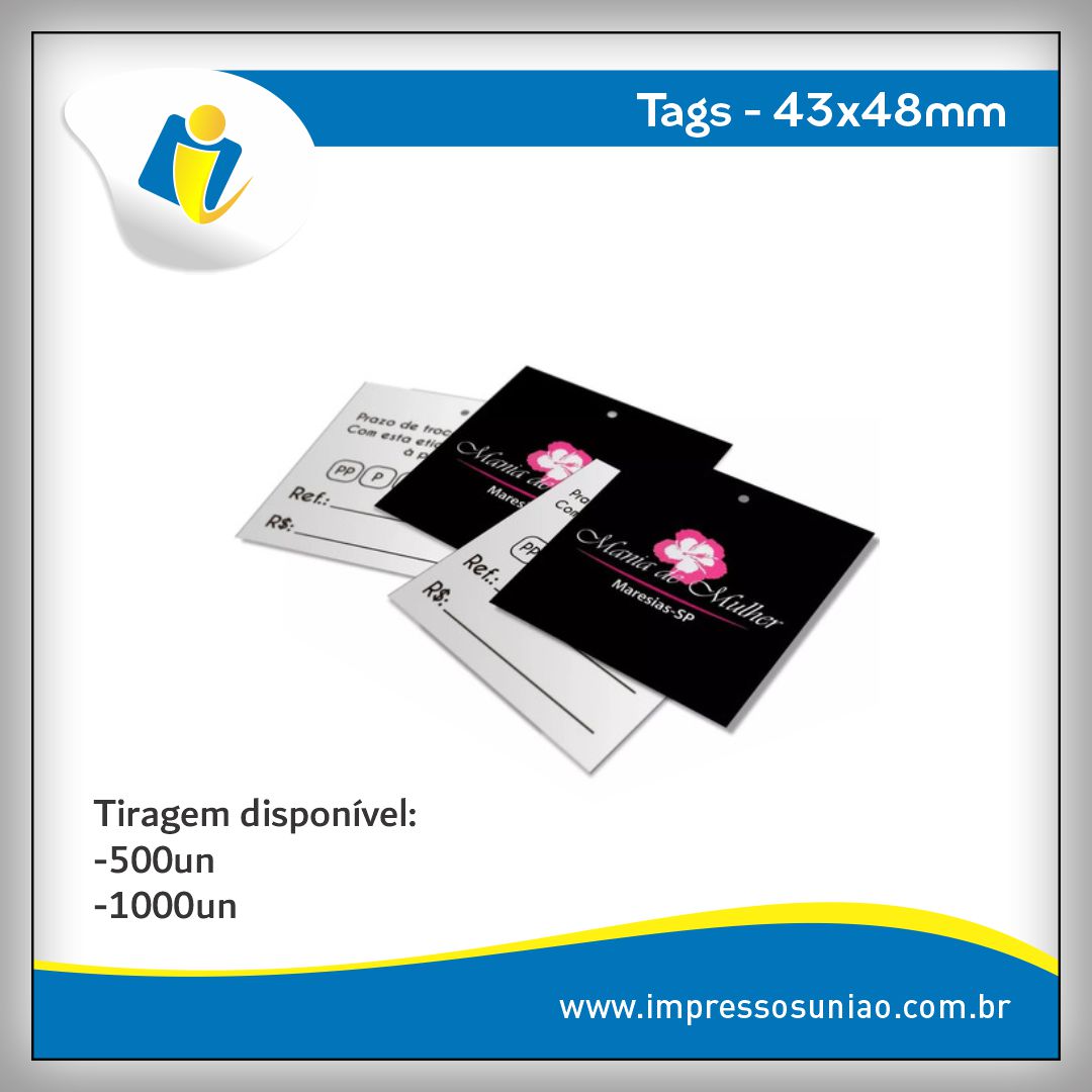 Esta tag com certeza vai evidenciar o seu produto. Feita em couché brilho 250g , ela possui o tamanho, sendo 48x88mm. A impressão pode ser feita colorida apenas na frente (4x0), colorida na frente e no verso preto e branco (4x1) ou colorida nos dois lados (4x4), sem aplicação de verniz ou com verniz total frente. O acabamento é o refile, famoso corte reto e também possui um furo de 4mm.